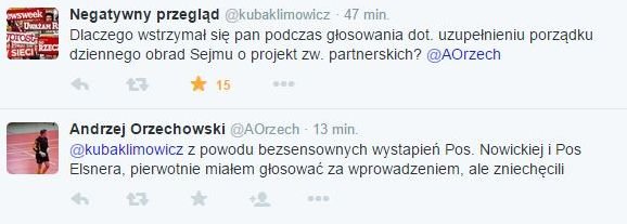Posłowie PO w sposób godny przedszkolaków, ale pozbawiony ich wdzięku, tłumaczą dlaczego wstrzymali się lub zagłosowali przeciw. Np. poseł Andrzej Orzechowski (Ełk) zagłosowałby za związkami, gdyby marsz. Wanda Nowicka i poseł Wincenty Elsner (SLD) siedzieli cicho. A tak, poświęcając sprawy wyborczyń i wyborców, musiał wstrzymać się od głosu, bo się zniechęcił.